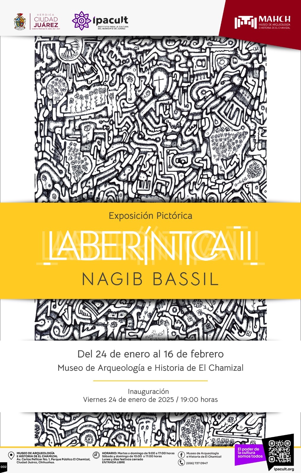 El Instituto para la Cultura del Municipio de Juárez (IPACULT) invita al público en general a la inauguración de la exposición pictórica “Laberíntica II”, una colección del artista Nagib Bassil, que se presentará en el Museo de Arqueología e Historia de El Chamizal (MAHCH).
