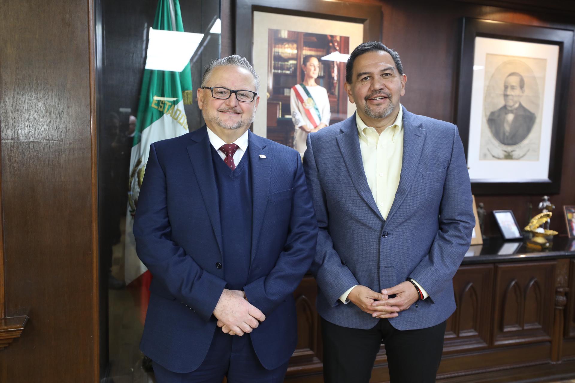 El Presidente Municipal, Cruz Pérez Cuéllar se reunió esta tarde con el Cónsul General de México en El Paso, Texas, Mauricio Ibarra Ponce de León, para hablar de diversos temas que tienen que ver con la posible llegada migrantes a esta frontera.