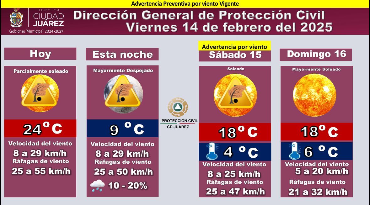 La Dirección General de Protección Civil informa sobre las condiciones climáticas para los próximos días y mantiene una advertencia por viento vigente para hoy viernes 14 y mañana sábado 15.