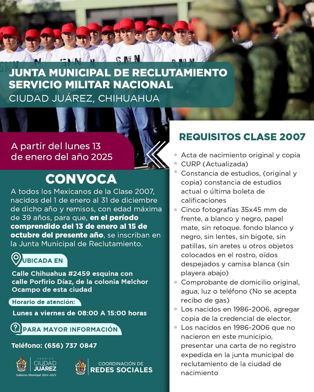 El director de Gobierno, Óscar Murillo, invitó a todos los juarenses de la clase 2007, nacidos del 1 de enero al 31 de diciembre de dicho año y remisos, con edad máxima de 39 años, para que en el periodo comprendido del 13 de enero al 15 de octubre de este año se inscriban en la Junta Municipal de Reclutamiento.
