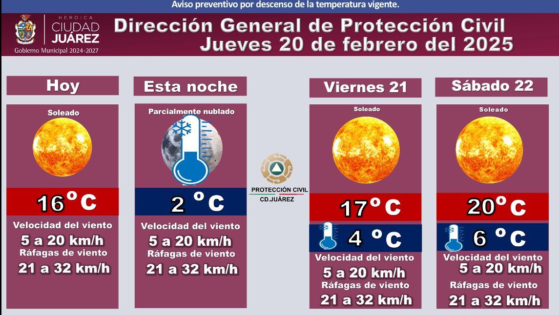 Las autoridades recomiendan a la población tomar precauciones ante el descenso de la temperatura durante las noches y las ráfagas de viento, así como mantenerse informados sobre cualquier actualización en el pronóstico del clima.