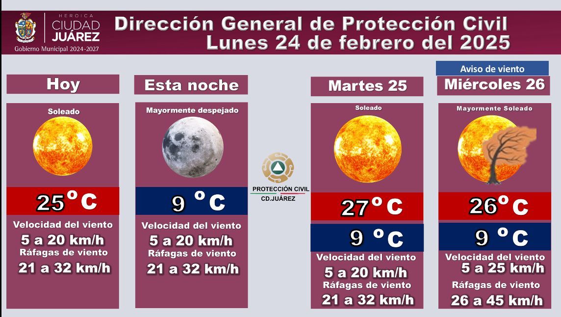 La Dirección General de Protección Civil informa el pronóstico del clima para los días 24, 25 y 26 de febrero de 2025.