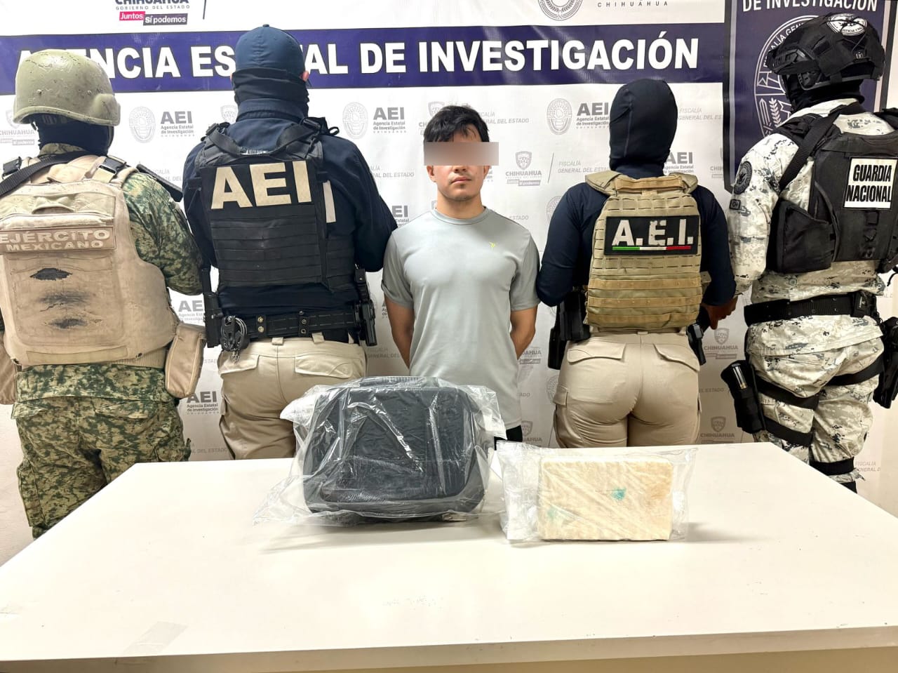 Elementos de la Agencia Estatal de Investigación, adscritos a la Fiscalía de Distrito Zona Norte, del Ejército Mexicano y la Guardia Nacional, detuvieron en Ciudad Juárez a un sujeto que se identificó como Luis Carlos O. M., por delitos contra la salud, ya que se le aseguró poco más de un kilogramo de cocaína en piedra.