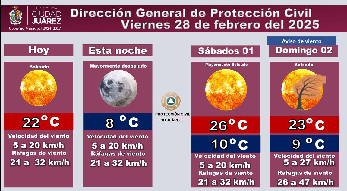 La Dirección General de Protección Civil dio a conocer el pronóstico del clima para los próximos días, destacando condiciones mayormente soleadas y la presencia de vientos moderados a fuertes.
