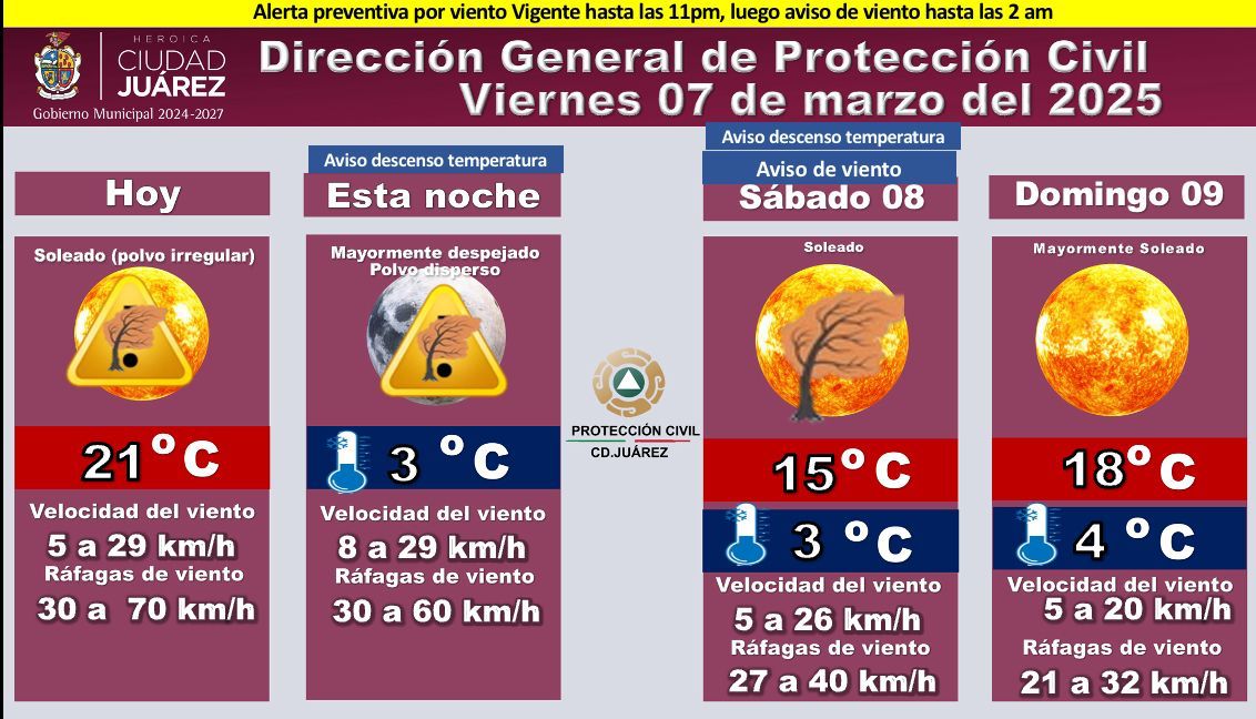 La Dirección General de Protección Civil informó que la alerta preventiva por viento se mantiene vigente hasta las 11:00 de la noche de este día, seguida de un aviso de viento hasta las 2:00 de la mañana.
