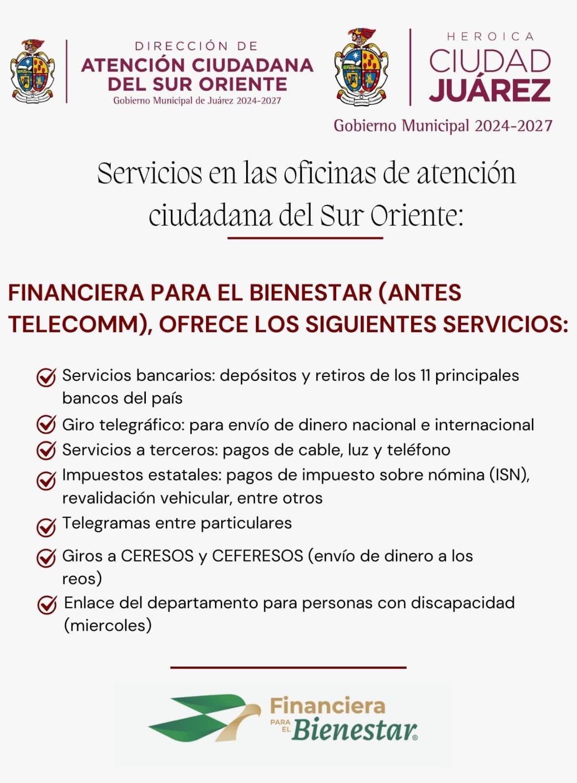 Mencionó que Financiera para el Bienestar también ofrece diversos servicios; depósitos y retiros de los 11 principales bancos del país, giro telegráfico, pagos de cable, luz, teléfono, así como giros a Ceresos y Ceferesos.