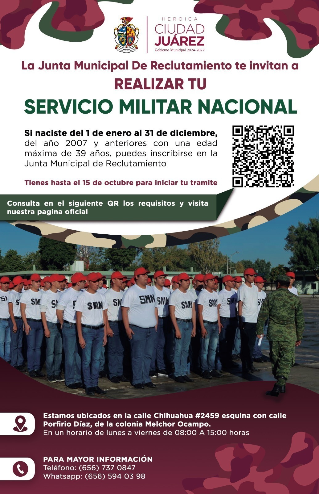 Murillo agregó que también pueden consultar la página de Facebook: Cartilla Militar Ciudad Juárez-Oficial, llamar al teléfono 656-737-0847 o enviar mensaje en la aplicación WhatsApp al número 656-594-0398.