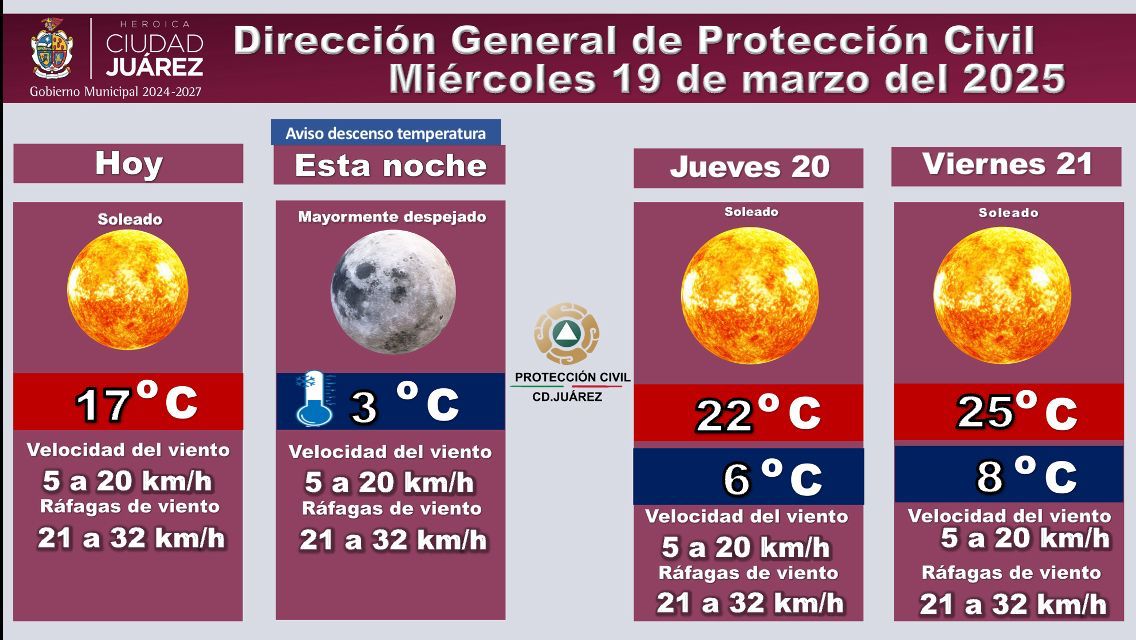 La Dirección General de Protección Civil informa que para este miércoles se espera un día soleado con una temperatura máxima de 17 °C.