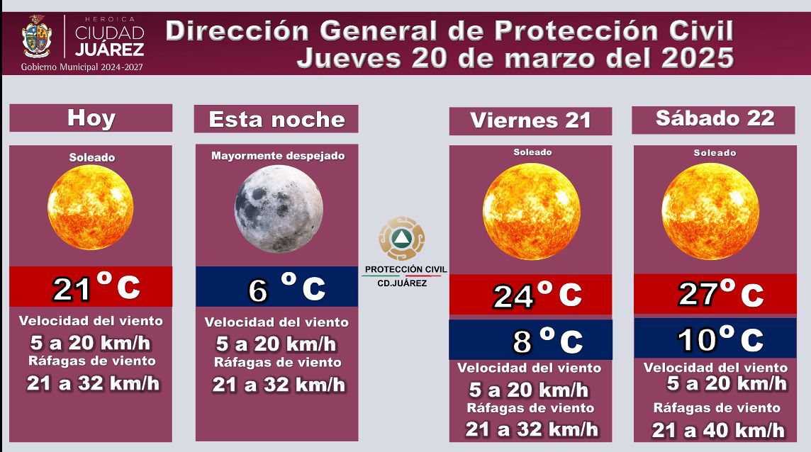La Dirección General de Protección Civil informa sobre el pronóstico del clima para este jueves 20 de marzo y los días siguientes.