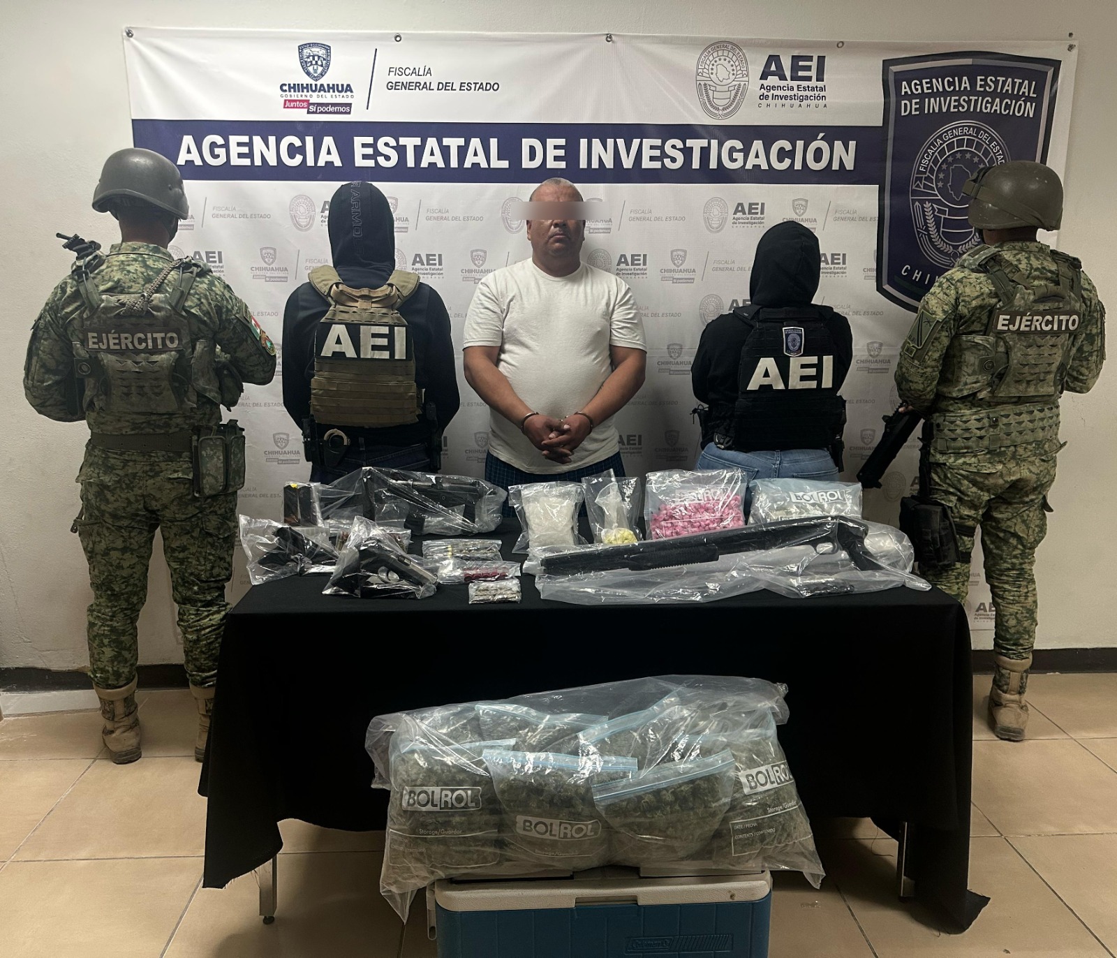 Le aseguraron una Uzzi, una escopeta y dos pistolas tipo escuadra, 3.4 kilogramos de mariguana y más de 700 gramos de metanfetamina • Fue puesto a disposición del Ministerio Público Federal Durante un operativo estratégico implementado por la Agencia Estatal de Investigación, en coordinación con el Ejército Mexicano en Ciudad Juárez, se logró la detención en el término de la flagrancia, de un masculino en posesión de cuatro armas de fuego de grueso calibre y cientos de envoltorios con droga preparada para su comercialización en narcomenudeo.La detención quien se identificó como Jorge Alberto G. G., de 48 años de edad, se registró la tarde de ayer jueves 20 de marzo en la calle Mariano Jiménez, cruce con la calle Coahuila de la colonia Salvárcar. Tenía a bordo de un vehículo color gris de la marca Dodge Ram línea 2500 Hervy Duty, modelo 2006, con placas de Nuevo México, Estados Unidos, lo siguiente: – 1 arma de fuego tipo UZZI en color negro con leyenda Mendoza. calibre .380mm con un cargador metálico, abastecido con un cartucho útil.- 1 arma de fuego tipo escopeta en color negro con la leyenda Mossberg nade in USA north Haven, calibre 12mm abastecida con 6 cartuchos útiles.- 1 arma de fuego tipo escuadra en color negro con la leyenda IORCIN, calibre .380mm automática, con un cargador metálico desabastecido.- 1 arma de fuego tipo escuadra en color negro con gris con la leyenda Beretta Gardone calibre .9mm con un cargador metálico abastecido con 4 cartuchos útiles.- 1 cargador metálico de arma de fuego corta en color negro metálico con la leyenda cal.9mm.- 1 cargador de plástico de arma de fuego corta en color negro de plástico con la leyenda Glock cal .40mm.- 15 cartuchos de escopeta calibre 12, más 5 cartuchos de escopeta en color rojo calibre 12 – 20 cartuchos de arma larga calibre 7.62×39 – 27 cartuchos de arma corta calibre 9mm – 8 bolsas tipo ziploc que contienen una hierba verde y olorosa con las características propias de la mariguana, con un peso total de 3.300 kilogramos.- 20 envoltorios de plástico transparente que en su interior contiene una hierba verde y olorosa con las características propias de la mariguana dando un peso 100 gramos.- 1 bolsa de plástico transparente que contiene una sustancia granulada y cristalina con las características propias de la metanfetamina, con un peso total de 358 gramos.- 733 envoltorios de plástico en color rosa que contienen una sustancia granulada y cristalina con las características propias de la metanfetamina, dando un peso total 360 gramos.- 50 envoltorios de plástico en color amarillo que contienen una sustancia granulada y cristalina con las características propias de la metanfetamina, dando un peso total 24.5 gramos.El detenido y lo asegurado fueron puestos a disposición del Agente del Ministerio Público Federal, para la continuidad de las investigaciones ministeriales por delitos contra la salud y por posesión ilegal de armas de fuego. **De acuerdo con las leyes y normas vigentes, el imputado se presume inocente mientras no se declare su responsabilidad mediante sentencia emitida por la autoridad judicial (artículo 13 del Código Nacional de Procedimientos Penales).