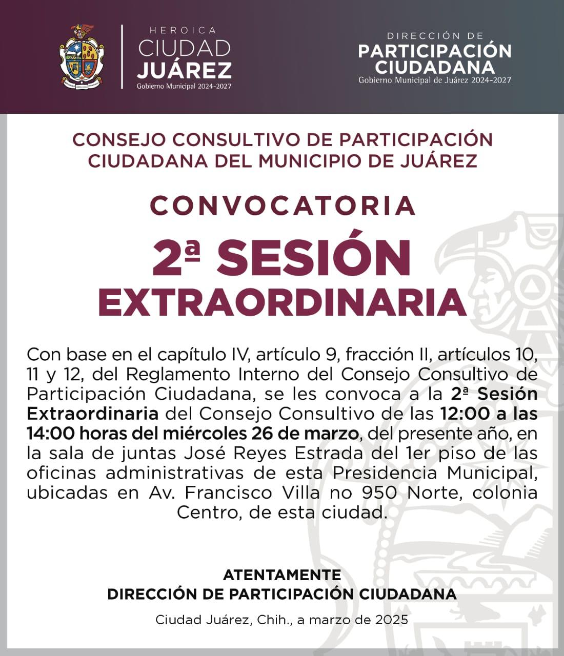 La Dirección de Participación Ciudadana invita a la ciudadanía a la sesión del Consejo Consultivo, la segunda extraordinaria del presente año y que se efectuará el próximo miércoles 26 de marzo, a las 12:00 del mediodía.