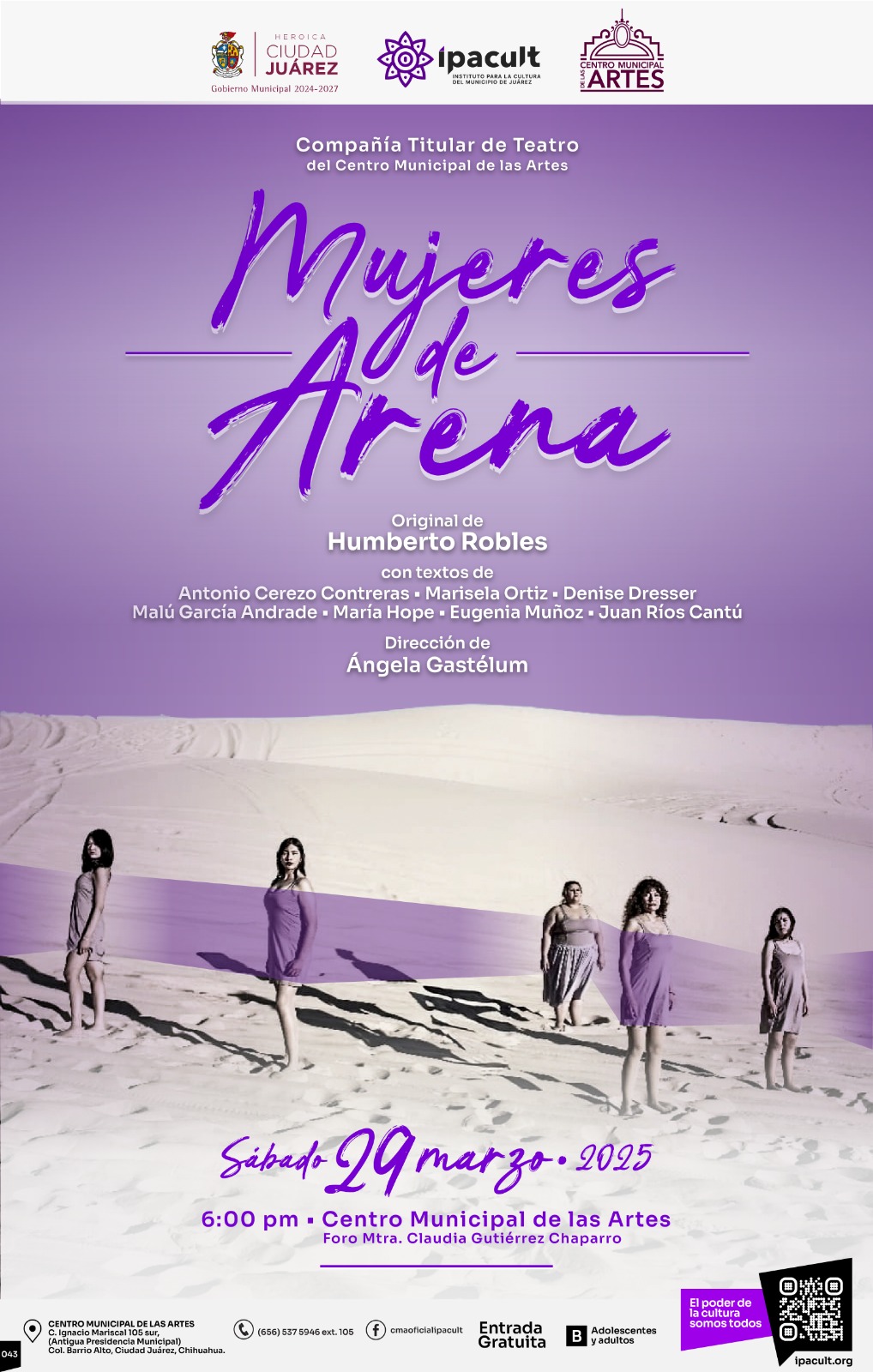 El Instituto para la Cultura del Municipio de Juárez (IPACULT) invita a la ciudadanía a presenciar la tercera presentación de la obra documental Mujeres de Arena, que tendrá lugar el próximo sábado 29 de marzo a las 6:00 de la tarde en el foro “Maestra Claudia Gutiérrez Chaparro” del Centro Municipal de las Artes (CMA).