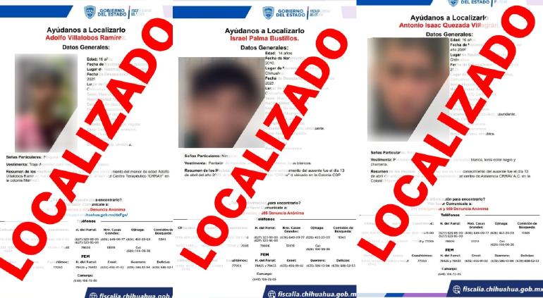 La Fiscalía de Distrito Zona Centro informó este lunes que fueron localizados sanos y salvos tres menores de edad que contaban con reporte de ausencia desde el domingo 13 de abril, luego de haber salido sin autorización del Centro de Asistencia CRRAV A.C., ubicado en la colonia Mármol I de la ciudad de Chihuahua.