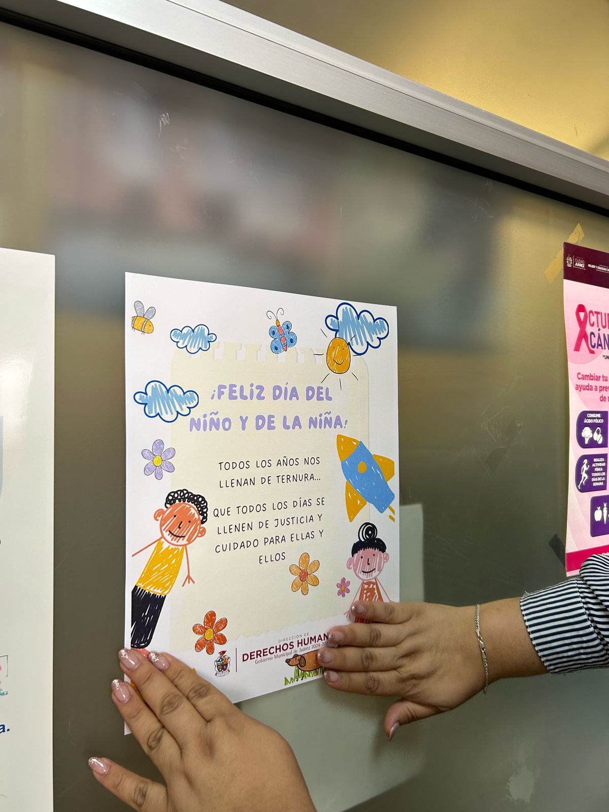 En el marco de las actividades del mes de abril, dedicado a la niñez, personal de la Dirección de Derechos Humanos colocó carteles informativos en el edificio de la Unidad Administrativa “Lic. Benito Juárez” (presidencia municipal), con el objetivo de visibilizar y promover los derechos de niñas y niños.