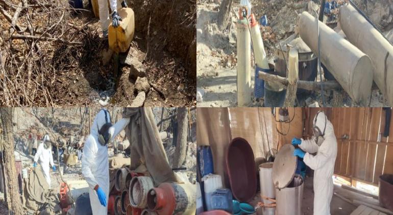 En total, se decomisaron 12,300 litros y 100 kilogramos de sustancias químicas empleadas para la fabricación de metanfetamina, así como cuatro centrifugadoras industriales, 64 tanques de gas LP y otro vehículo.