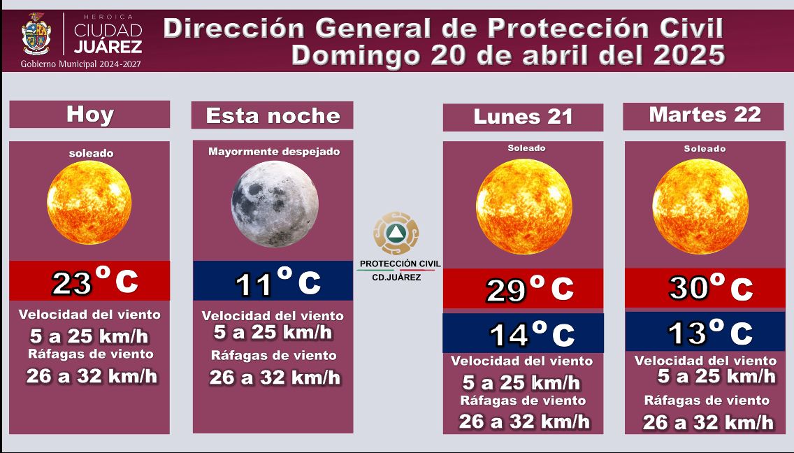 La Dirección General de Protección Civil de Ciudad Juárez emitió el pronóstico del clima correspondiente a este domingo 20 de abril.