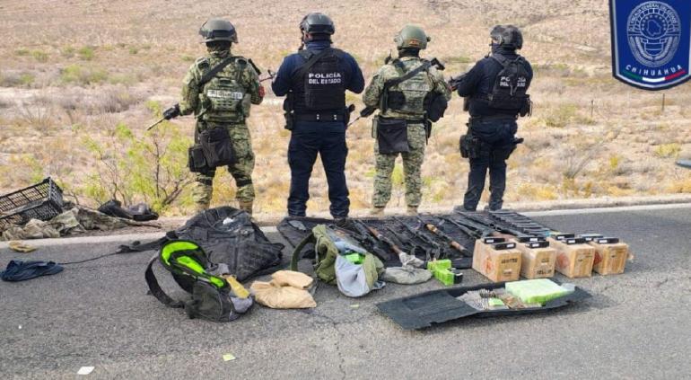 Elementos de la SSPE, Ejército Mexicano y Guardia Nacional localizaron y aseguraron dos pick ups así como decomisaron 9 armas largas y dos mil cartuchos de distintos calibres, así como cuatro artefactos caseros explosivos tras el enfrentamiento en la carretera a Ojinaga.