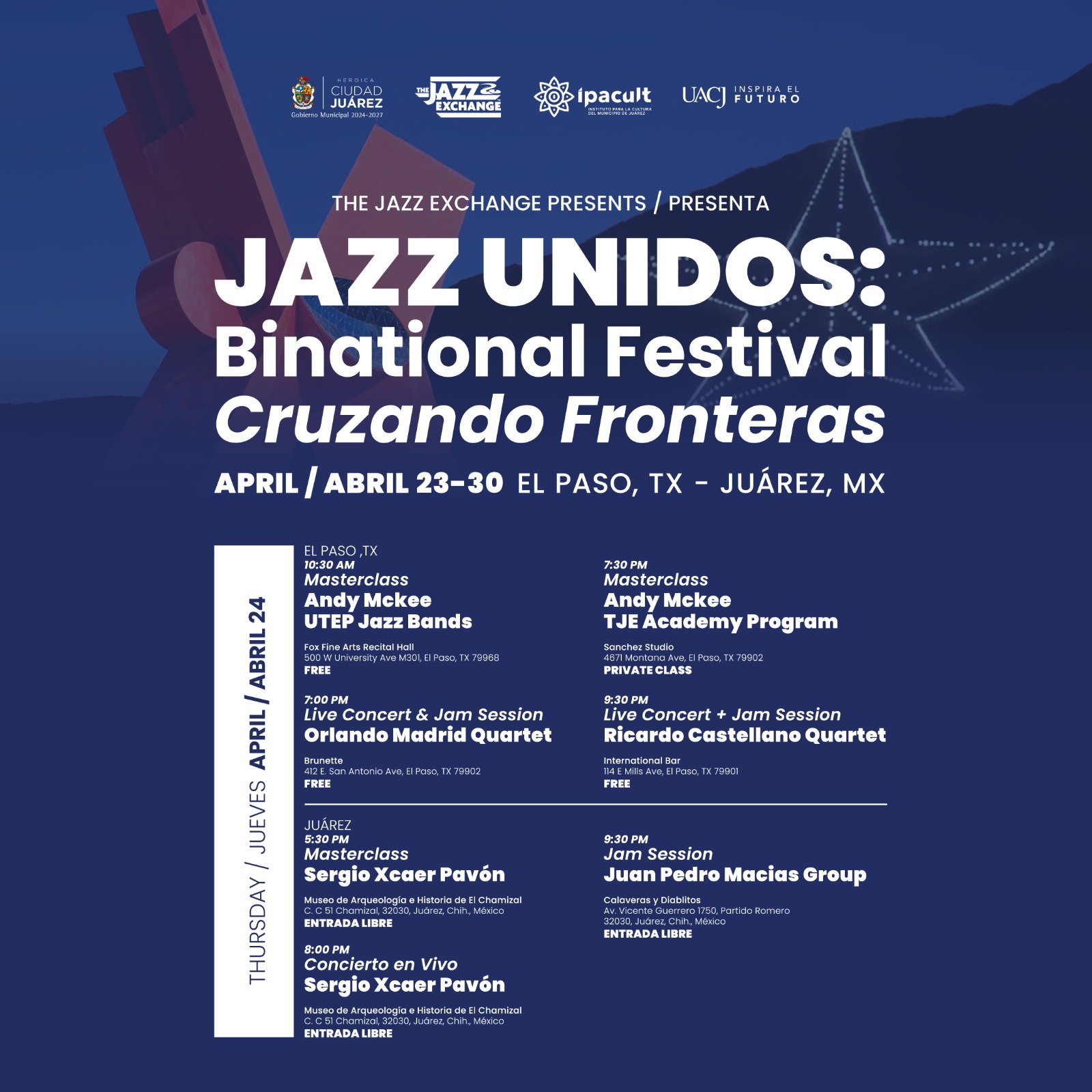 El Jazz Unidos: Binational Festival – Cruzando Fronteras sigue su curso este jueves 24 de abril, con una intensa programación que resalta el talento binacional a través del jazz.