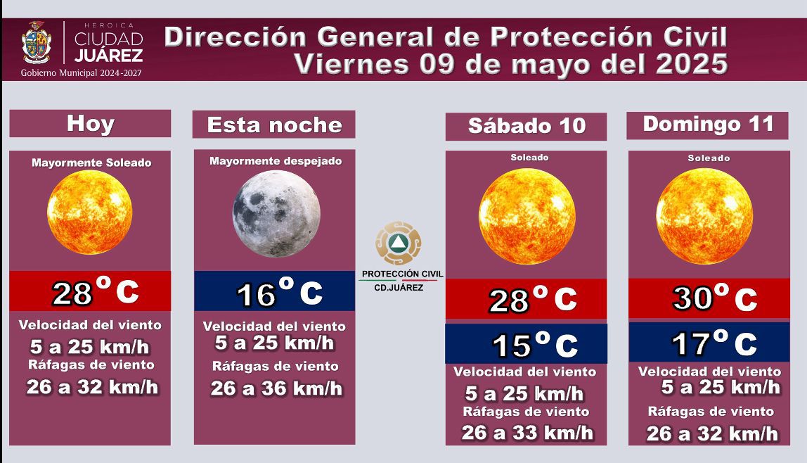 La Dirección General de Protección Civil informa el pronóstico del clima para este fin de semana, correspondiente de hoy viernes 9 al domingo 11.