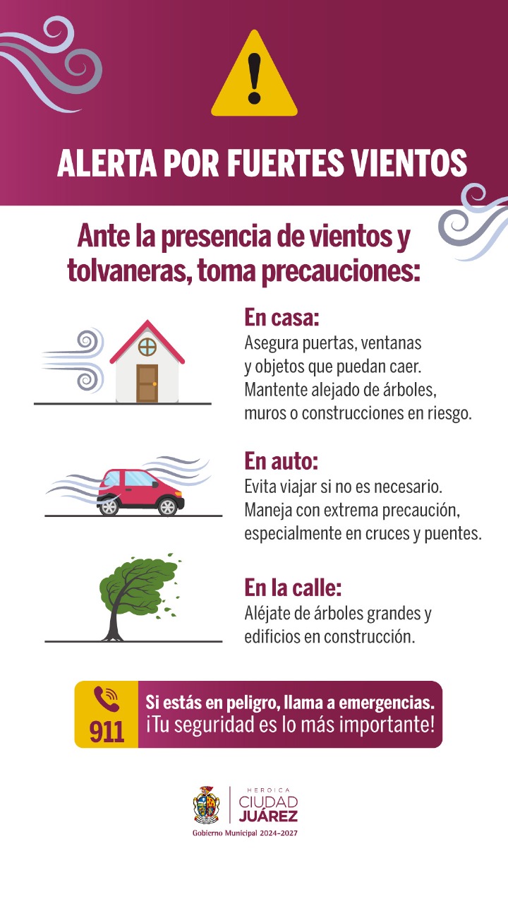 El titular de la Dirección General de Protección Civil, Sergio Rodríguez, informó que permanece vigente una alerta preventiva por viento en la ciudad, con base en las proyecciones meteorológicas que indican un incremento en su velocidad a partir de las 9:00 de la mañana, alcanzando su punto máximo entre las 3:00 y las 7:00 de la tarde.
