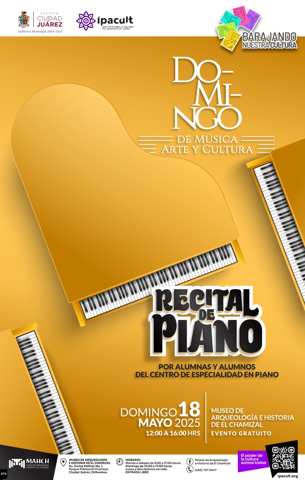 El Instituto para la Cultura del Municipio de Juárez (IPACULT) invita a la comunidad fronteriza a disfrutar del recital gratuito “Do-Mi-ngo de Música, Arte y Cultura”, que se llevará a cabo este domingo 18 de mayo a las 12:00 del mediodía en el Museo de Arqueología e Historia de El Chamizal (MAHCH).