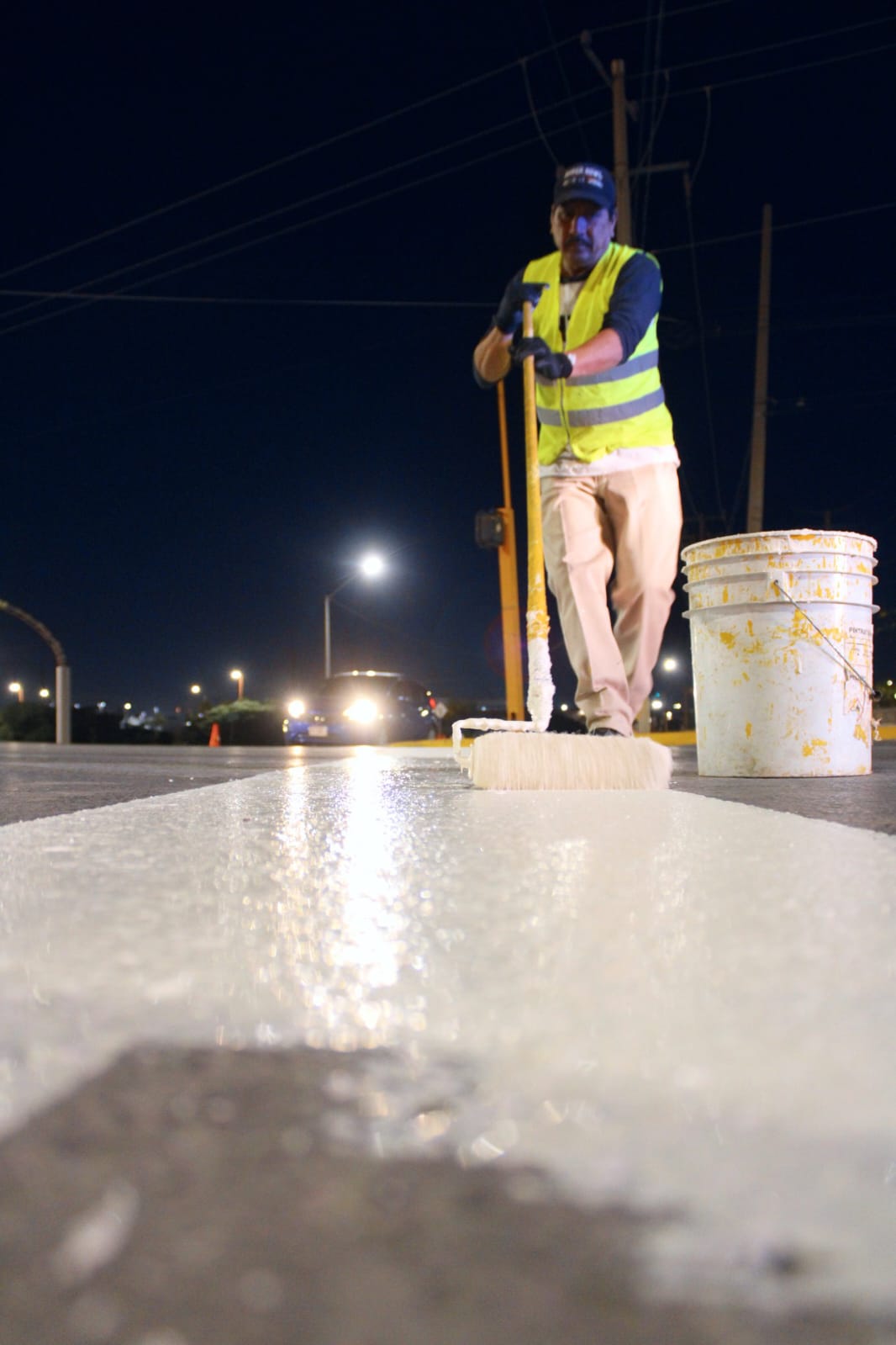 Con el objetivo de fortalecer la seguridad vehicular y peatonal de los juarenses, personal del área de Control de Tráfico de la Coordinación General de Seguridad Vial, realizó durante la noche trabajos de aplicación de pintura en los cuatro cruces de la avenida Plutarco Elías Calles y avenida Heroico Colegio Militar, así como en el cruce del bulevar Teófilo Borunda y avenida Tecnológico.