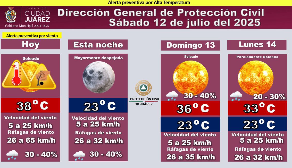 La Dirección General de Protección Civil de Ciudad Juárez emitió una alerta preventiva por altas temperaturas y vientos para este sábado 12 de julio del 2025.