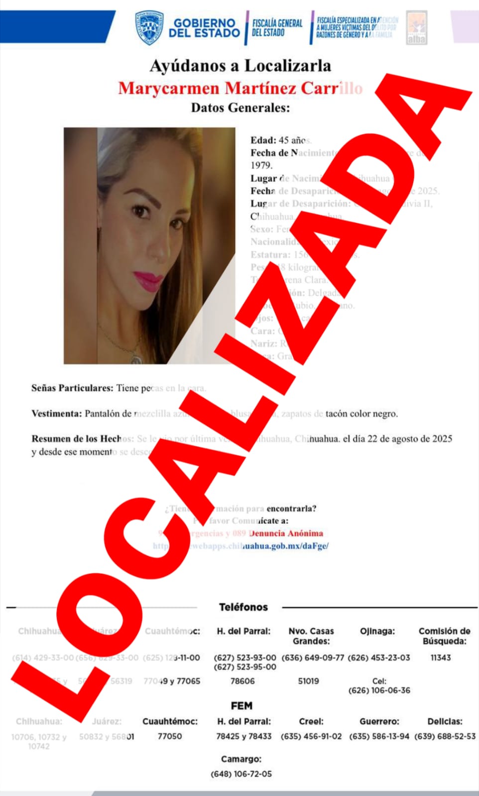 Afortunadamente, este día se reportó su localización y en su declaración, manifestó que su ausencia fue voluntaria, no haber sido víctima de algún delito y que se encuentra bien de salud, lo que constatado por el Ministerio Público.