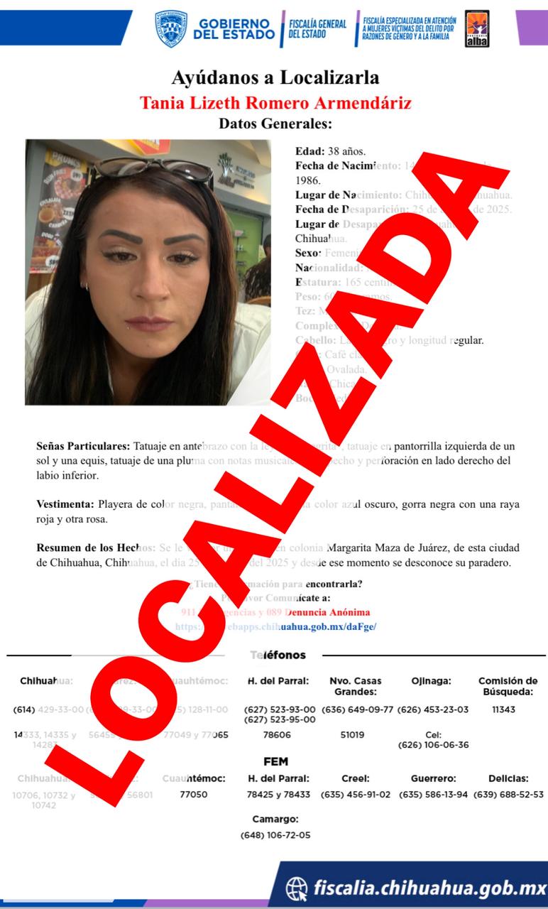 El reporte de la ausencia de Tania Lizeth, de 38 años de edad, fue interpuesto por sus familiares el día 25 de agosto del presente año, luego de haber sido vista por última vez en calles de la colonia Margarita Maza de Juárez, en la ciudad de Chihuahua.