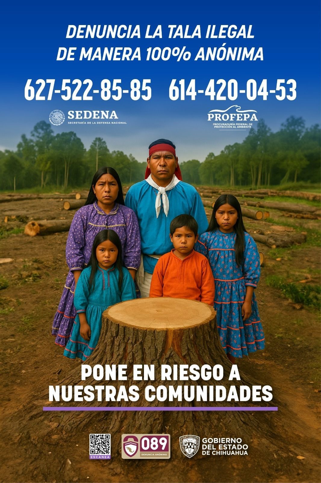 En los carteles y posters que son colocados a lo largo y ancho del estado, se invita a denunciar de manera anónima, a través de los números telefónicos: 627 522-85-85 y 614 420-04-53.