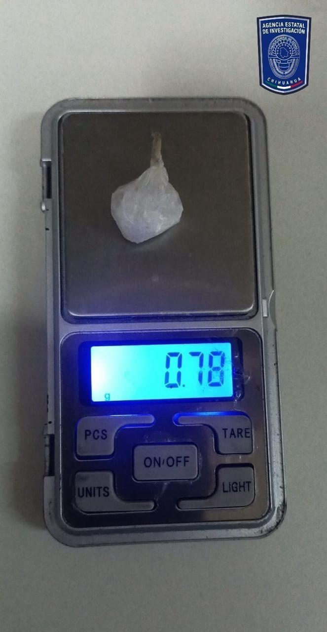 Al realizarle una inspección, se le encontró entre sus pertenencias un envoltorio de plástico transparente que contenía una sustancia granulosa y cristalina, con un peso de .54 gramos de cristal.