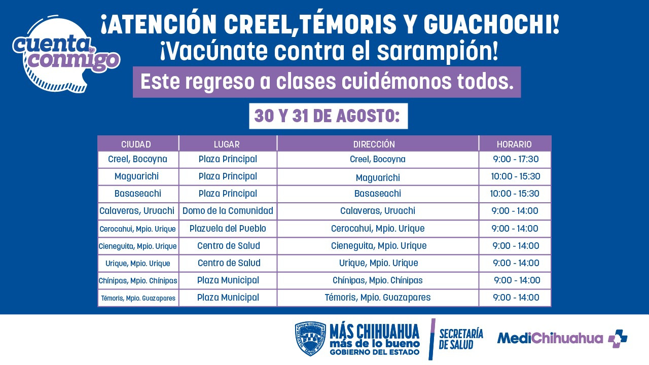En Témoris, Chínipas y Cerocahui, todo se desarrollará en la plaza municipal, al igual que en el Centro de Salud de Cieneguita y de Urique, los días 30 y 31 de agosto, de 9:00 a 14:00 horas.