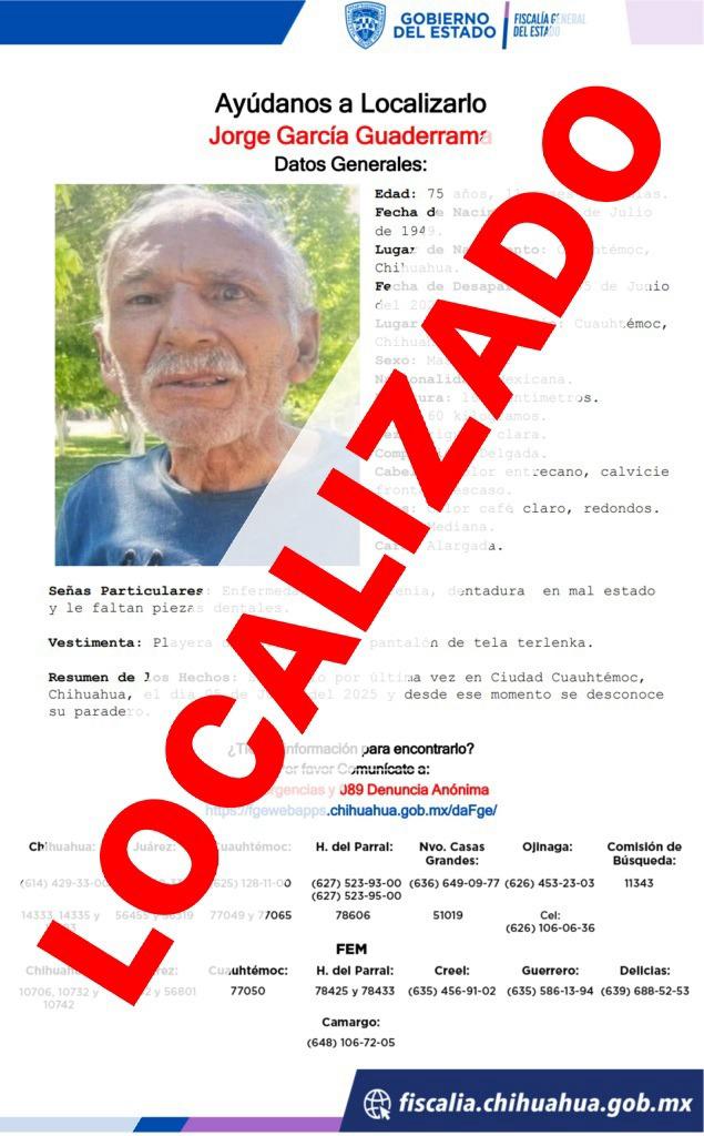 La Fiscalía de Distrito Zona Occidente, a través de la Unidad de Investigación de Personas Desaparecidas y/o Ausentes, localizó salvo y salvo a Jorge G. G., persona de 75 años edad, que era buscada en calidad de desparecida desde que se ausento de su domicilio el 05 de junio del 2025, en el municipio de Cuauhtémoc.