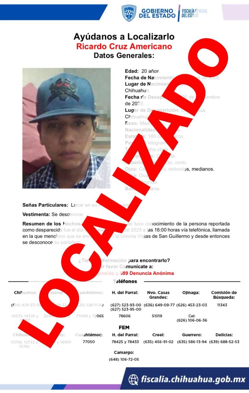 La Unidad Especializada en Investigación de Personas Desaparecidas y/o Ausentes, localizó sano y salvo a Ricardo C. A., de 20 años de edad, quien contaba con reporte de desaparición interpuesto en la ciudad de Chihuahua.