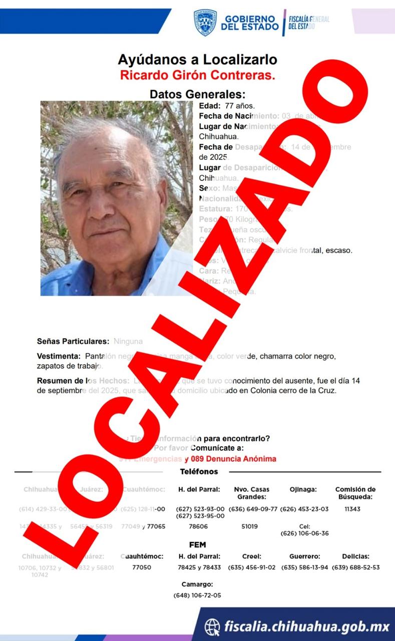 La Unidad Especializada en Investigación de Personas Desaparecidas y/o Ausentes, localizó sano y salvo a Ricardo G. C., de 77 años de edad, quien contaba con reporte de desaparición interpuesto este lunes 15 de septiembre, en la ciudad de Chihuahua.