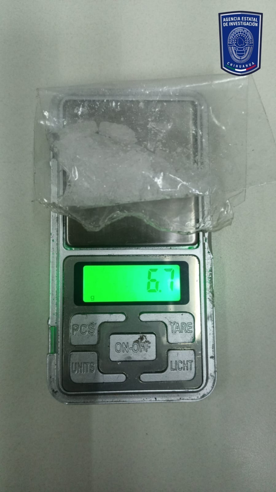 Al masculino se le encontró en posesión de un envoltorio con una sustancia granulosa y cristalina que dio un peso de 5.2 gramos de la metanfetamina, también conocida como cristal.