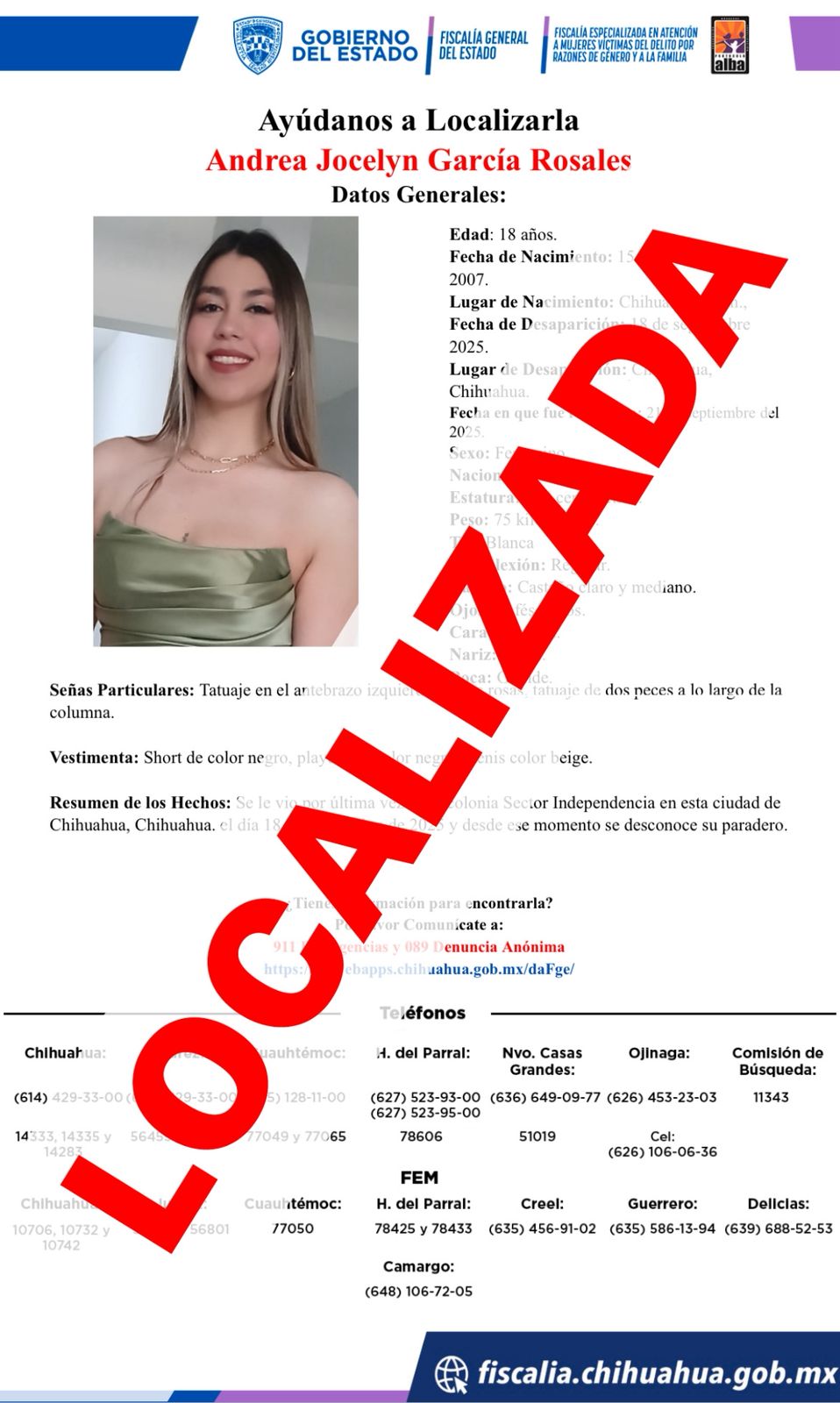 De igual manera, Andrea Jocelyn G. R., de 18 años de edad, fue reportada el 21 de septiembre, luego que dejaron de saber de ella el día 18 de septiembre en la colonia Sector Independencia.