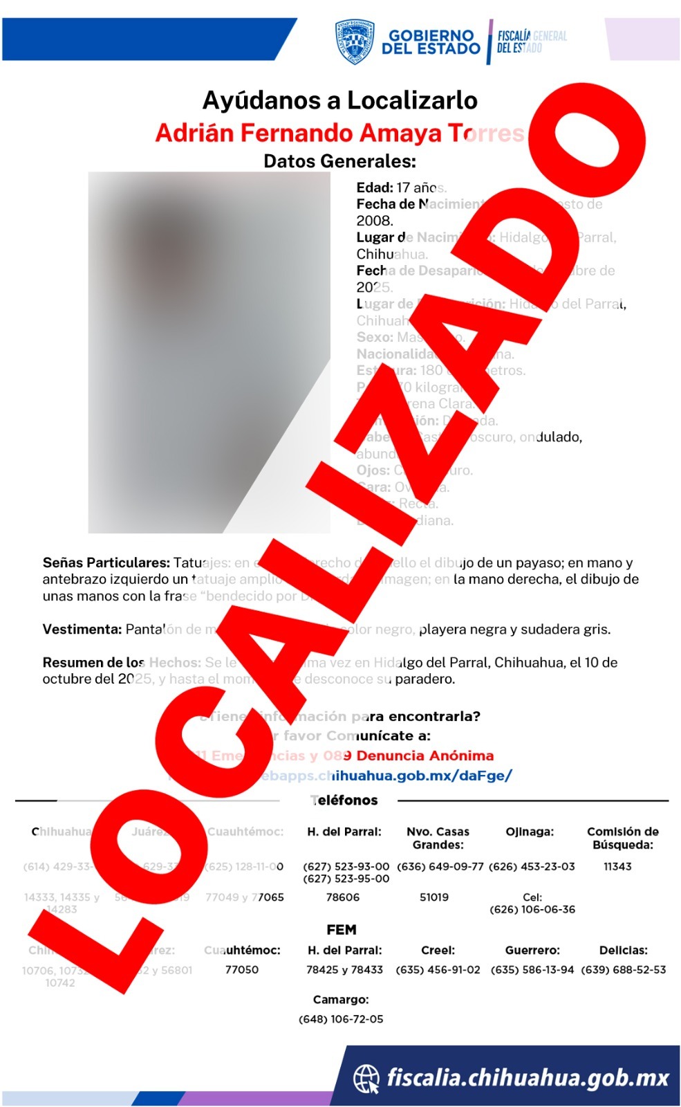 En Parral, localizaron al adolescente de iniciales A.F.A.T., de 17 años de edad, cuya ausencia se reportó el 10 de octubre del presente año.