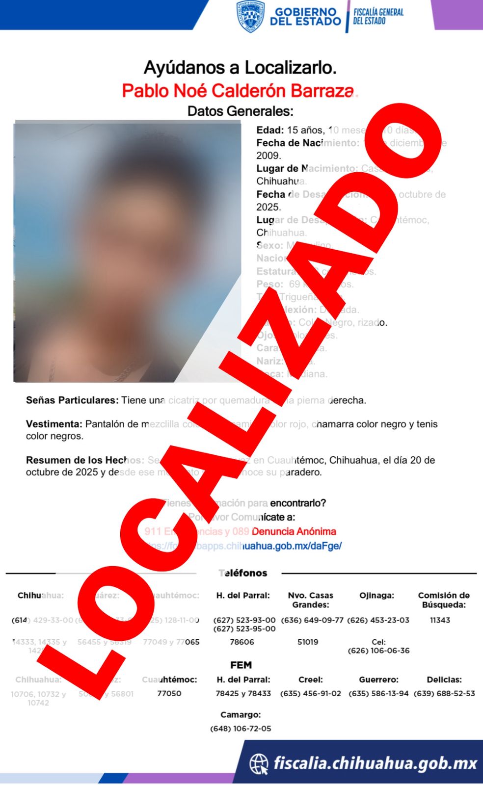 Al ser localizado, el menor, de 16 años de edad identificado con las iniciales P.N.C.B., manifestó ante el Ministerio Público y agentes de la Unidad de Investigación de Personas Desaparecidas y /o Ausentes, que salió de su domicilio en forma voluntaria.