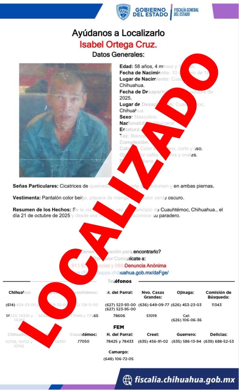 La Fiscalía de Distrito Zona Occidente, localizó sano y salvo a Isabel O. C., de 58 años de edad, quien contaba con reporte de ausencia interpuesto en el municipio de Cuauhtémoc.