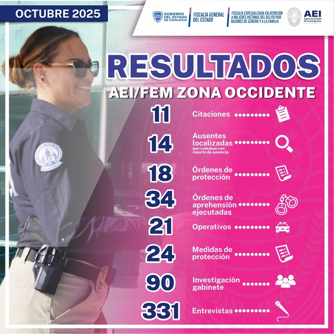 Como parte de la investigación y combate a los delitos de género en la zona occidente del estado, elementos de la Agencia Estatal de Investigación (AEI) cumplimentaron durante el mes de octubre, 34 órdenes de aprehensión en contra de responsables de delitos de género en los municipios de Cuauhtémoc, Guerrero y en Creel, municipio de Bocoyna.