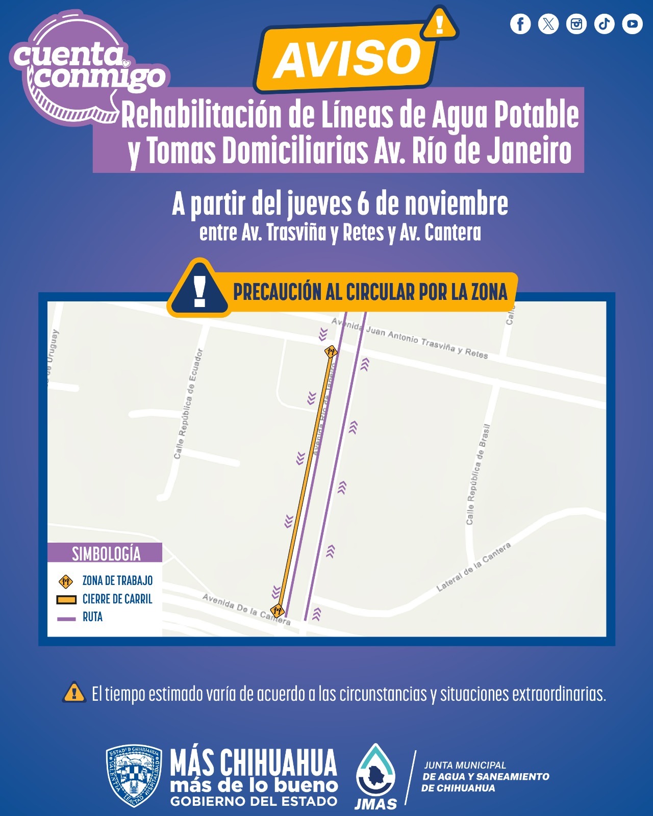 La Junta Municipal de Agua y Saneamiento (JMAS) de Chihuahua iniciará este jueves 6 de noviembre, los trabajos de rehabilitación de líneas de agua potable y tomas domiciliarias en la avenida Río de Janeiro, de la colonia Panamericana.