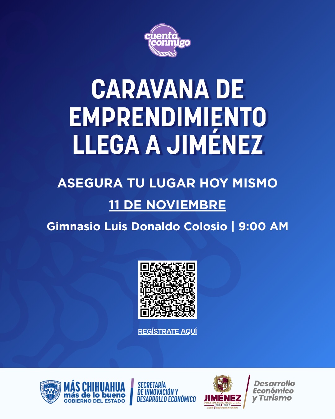 El Gobierno del Estado de Chihuahua, a través de la Secretaría de Innovación y Desarrollo Económico (SIDE), en coordinación con el Municipio de Jiménez, invita a la Caravana de Emprendimiento, que se llevará a cabo el martes 11 de noviembre en las instalaciones del Gimnasio Luis Donaldo Colosio.