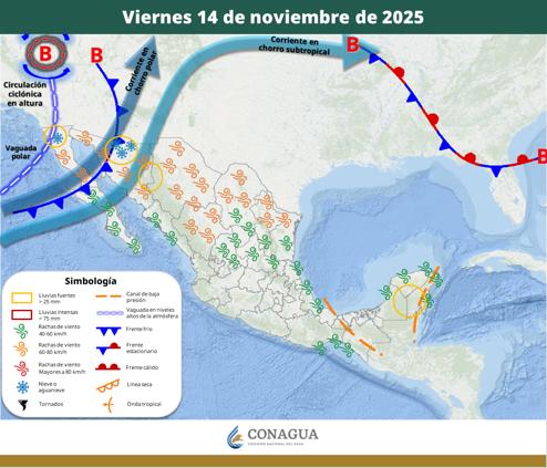 Además, hay zonas que esperan lluvias fuertes: Península de Yucatán, sierra entre Sonora y Chihuahua, norte de Baja California y norte de Sonora.