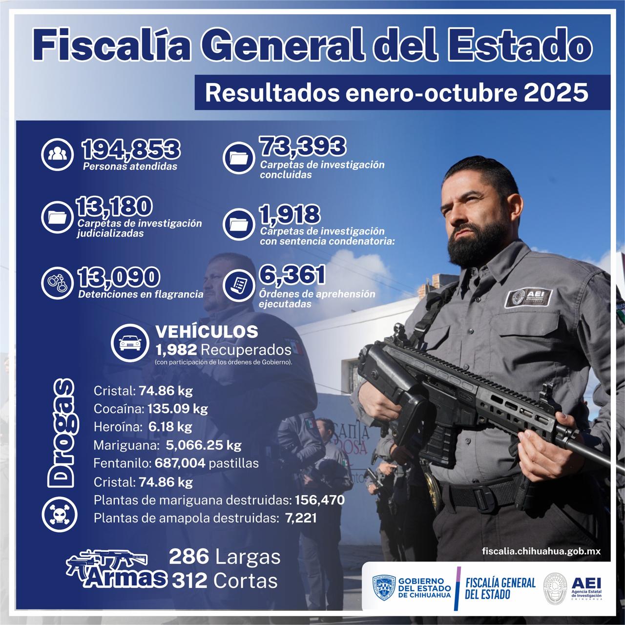 Alrededor de 200 mil personas atendidas, más de 73 mil carpetas de investigación concluidas, 13 mil 180 judicializadas y más de mil 900 sentencias condenatorias, son algunos de los resultados obtenidos en las diversas áreas de la procuración de justicia por la Fiscalía General del Estado, en el periodo de enero a octubre del 2025.