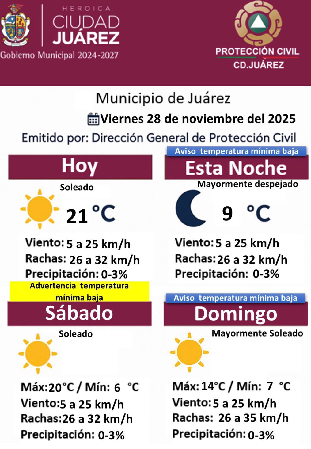 La Dirección General de Protección Civil del Municipio informó las condiciones meteorológicas previstas para hoy viernes 28 de noviembre y el fin de semana, destacando la presencia de avisos por temperaturas mínimas bajas durante las próximas noches.