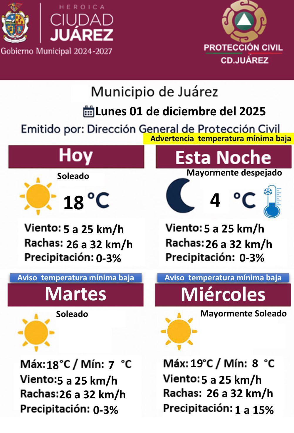 La Dirección General de Protección Civil del Municipio dio a conocer el pronóstico del clima correspondiente al lunes 1 de diciembre de 2025, acompañado de una advertencia por temperaturas mínimas bajas que se mantendrán durante los próximos días.