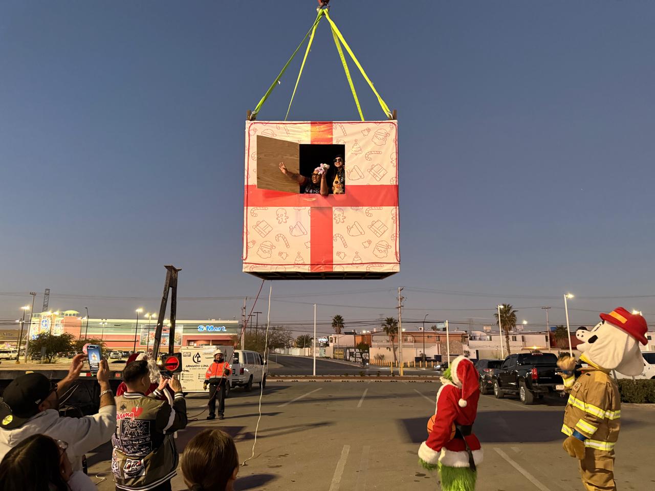 La campaña solidaria “Un Regalo de Altura III” inició este jueves en el exterior de Plaza Sendero, donde los locutores juarenses Román Vázquez y Shaon Ortiz ascendieron a más de 40 metros de altura dentro de una estructura metálica de 2×2 metros decorada como un regalo gigante.