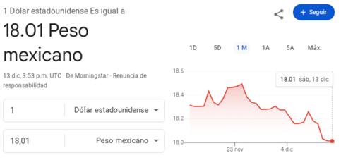El Banco de México cerró la semana desde el jueves con el dólar spot (referencia entre bancos y mercados) a 18.03 pesos. El viernes fue inhábil, pues el Día de la Virgen de Guadalupe también es asueto en México al ser considerado Día del Empleado Bancario.