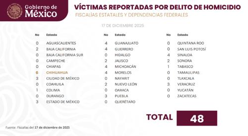 Chihuahua fue el estado que registró la mayor cantidad de víctimas por presunto homicidio en todo el país durante el miércoles, según informe preliminar de las autoridades.